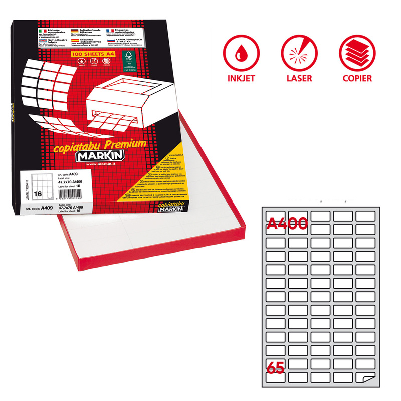 Etichetta adesiva A/400 bianca 100fg A4 38,1x21,2mm (65eti/fg) Markin