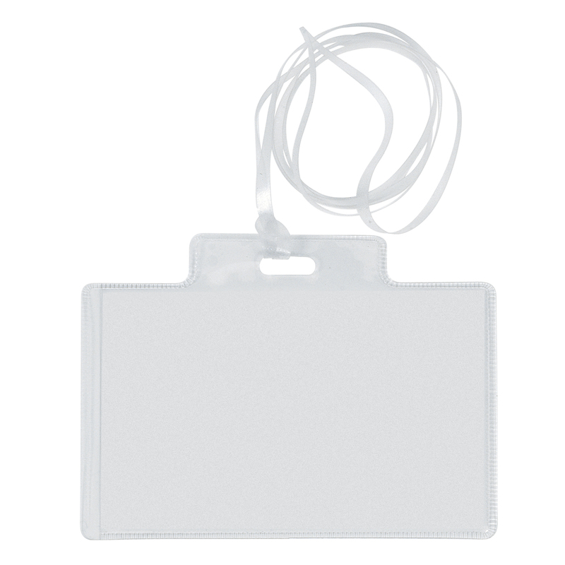 PORTA NOMI IN PVC TRASPARENTE, ALTO SPESSORE, COMPLETI DI CORDONCINI IN PLASTICA E CARTONCINI. I CORDONCINI SONO A NORME DI SICUREZZA ANTI SOFFOCAMENTO. ADATTI A CONGRESSI, RIUNIONI, VISITE GUIDATE. INSERIMENTO DEL CARTONCINO DAL LATO CORTO. FORMATO 95X60MM.